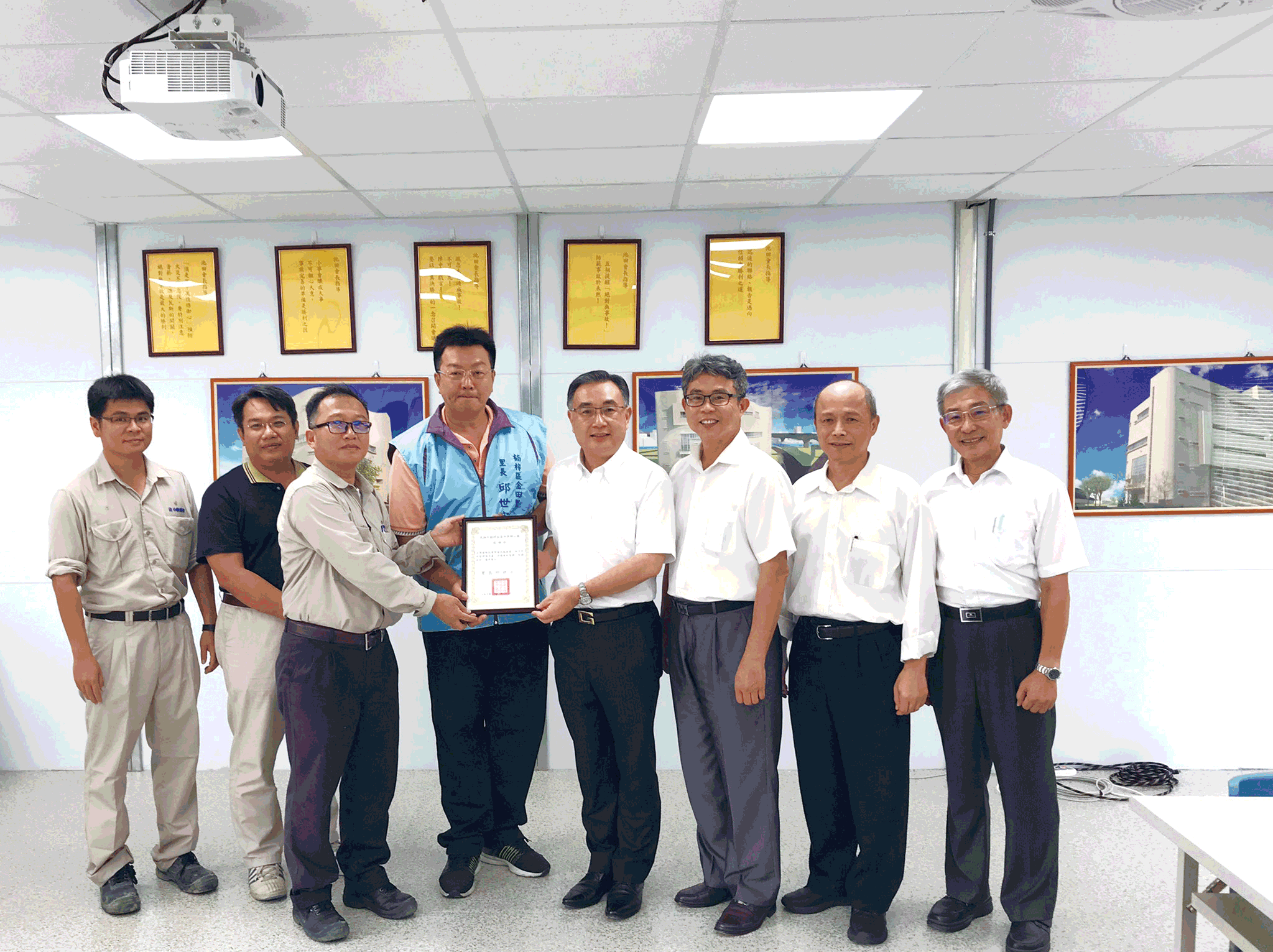 近日,台灣南部有許多地方遭大雨侵襲,因淹水、溼氣重等原因,導致許多人罹患皮膚病,甚至傳出登革熱的疫情。 為消除病媒孳生源,維護社區鄰里環境,創價積極協助高雄市政府致力於楠梓區金田里的社區環境消毒工作,該里里長邱世宗(右5)特於8月15日頒贈感謝狀給創價,副理事長洪玉柱代表接受。