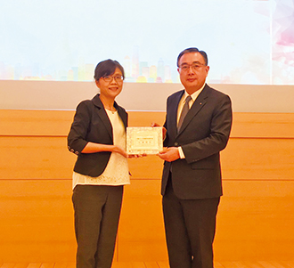 11月25日下午,在中鋼集團總部國際會議廳舉行頒獎典禮,高雄市環保局技正許錦春代表市政府頒發「永續環保」獎牌給創價,洪玉柱副理事長代表受獎。