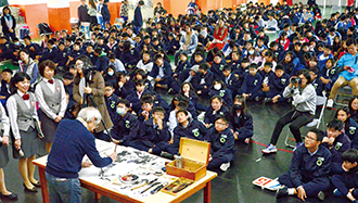當天,戴教授現場揮毫示範。為了讓大家清楚看到揮毫過程,校方特別在現場投影直播,當看到戴教授揮毫流暢地運筆與絕佳的構圖時,同學們都驚呼連連。