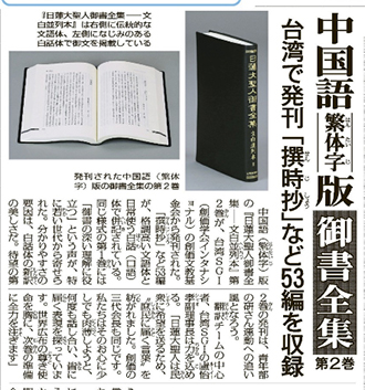 《聖教新聞》於2019年12月26日在頭版以「台灣發行繁體中文版《日蓮大聖人御書全集 文白並列本II》 收錄〈撰時抄〉等53篇重要御書」為標題,刊載台灣SGI發行《御書文白並列本II》的好消息,本報特別加以轉載,以饗讀者。