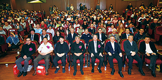 中國文化大學1月10日下午邀請2020東京奧運主場館設計者、東京大學教授隈研吾(右圖前排左4),在該校體育館舉行的「華岡大講堂」,以「森林時代」為題發表演講,執行長林廷鋒代表創價應邀出席。
