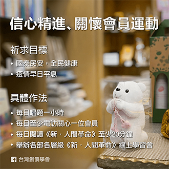 值此新冠肺炎疫情蔓延、人心惶惶之際,林理事長呼籲大家配合政府各項防疫措施、做好健康管理,落實推進「信心精進、關懷會員」運動,未來更要全力辦好「心靈綠洲」的線上座談會,齊心祈求國泰民安、全民健康,疫情早日平息。