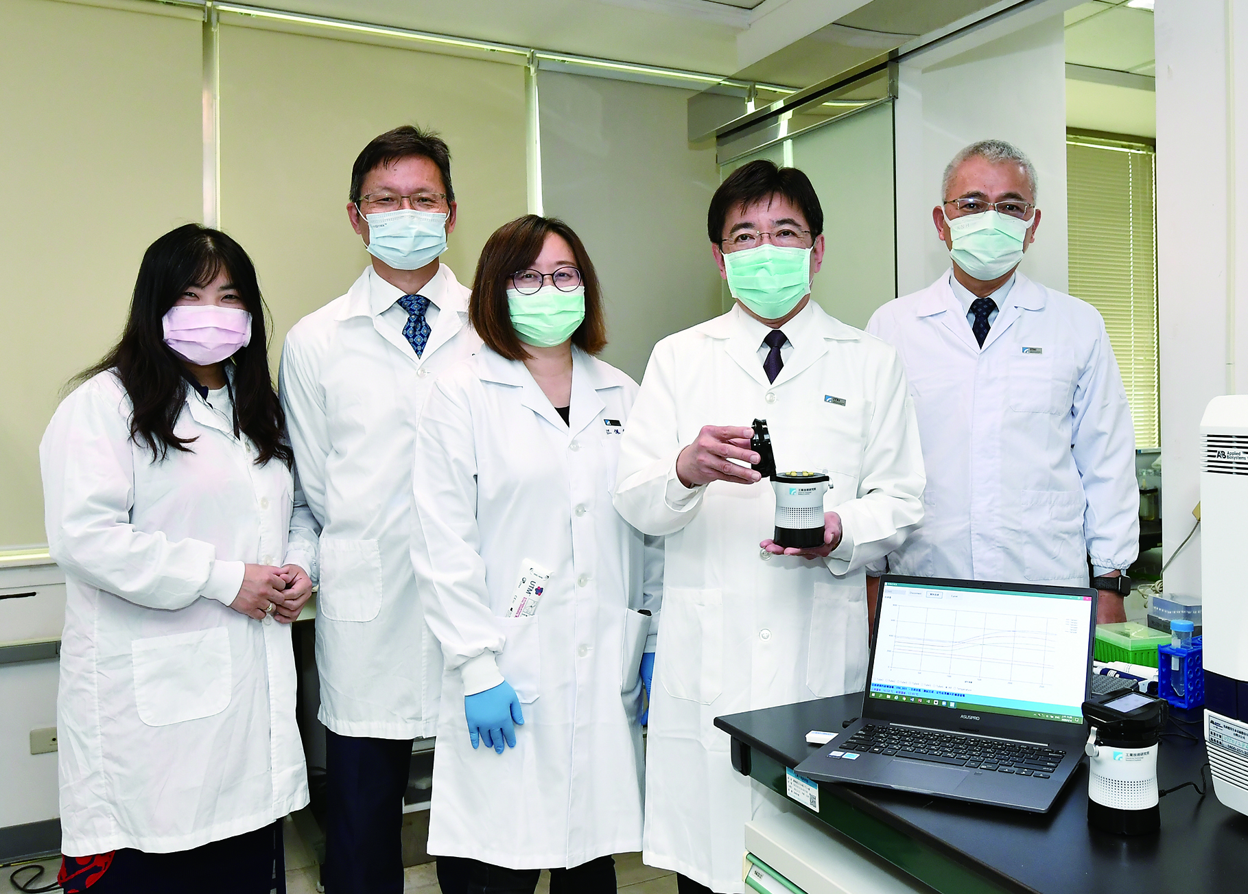 工研院研發的疫開罐,為國人守護防疫線。(右起:工研院副院長張培仁、工研院院長劉文雄、工研院生醫所副組長江佩馨、工研院生醫所所長林啟萬、工研院行銷傳播處處長林佳蓉)