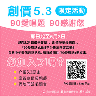 迎向5.3,創價透過LINE通訊軟體,在「90愛對話」平台貼文串,精心設計「創價5.3之90愛唱題90感謝您」限定活動,對此,林釗理事長勉勵大家在防疫期間積極推進「信心精進、關懷會員」運動,一同來勤勵信、行、學。
