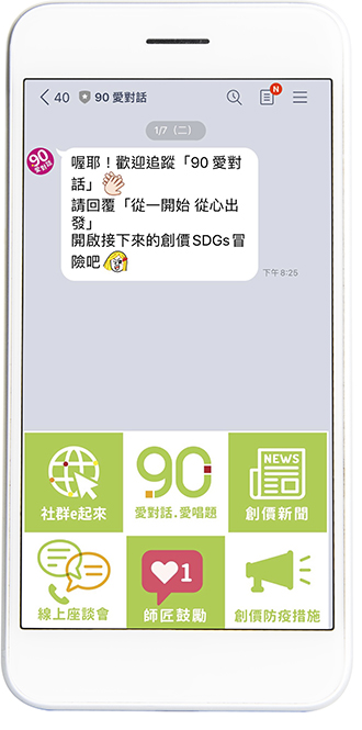 「90愛對話」LINE平台,即日起已新增「社群e起來」、「線上座談會」、「師匠鼓勵」及「創價防疫措施」等四項功能。