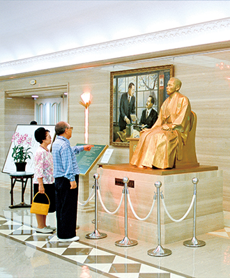 2001年7月,池田先生伉儷在牧口先生坐像前,緬懷他尊貴的一生。 (東京牧口紀念會館) |