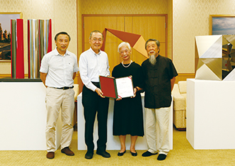 重要推手美譽的李再鈐教授,對創價積極推進文化、教育活動的努力給予肯定,繼2018年致贈雕塑作品〈低限的無限〉給創價之後,7月2日下午再度蒞臨至善文化會館,將他的作品〈自強不息〉、〈天地人和〉、〈虛實之間〉等致贈給創價,林釗理事長代表接受。