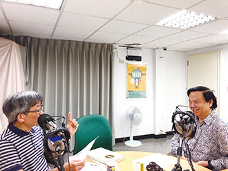 《藝術家》雜誌創辦人何政廣(右)接受廖新田教授(左)採訪