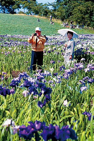 在北海道鼓勵會員的空檔,池田先生伉儷在花園裡拍攝相片。 《聖教新聞》提供