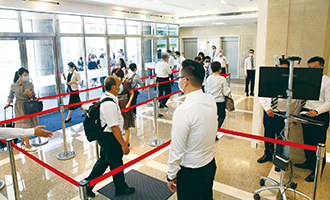 工作人員引導與會者入場,量體溫、戴口罩,並請大家維持適當社交距離。 |
