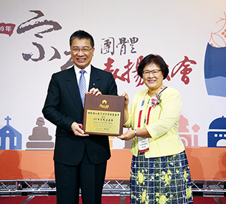 內政部長徐國勇(左)頒發宗教公益獎給創價,副理事長杜季貞代表接受。