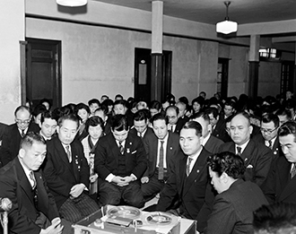 1959年元旦,池田先生與弟子代表一起聆聽收錄戶田先生演講內容的錄音帶。        《聖教新聞》提供