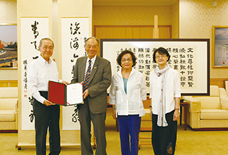 書法家連勝彥(左2)致贈作品給創價,林釗理事長頒贈「典藏狀」表達感謝。