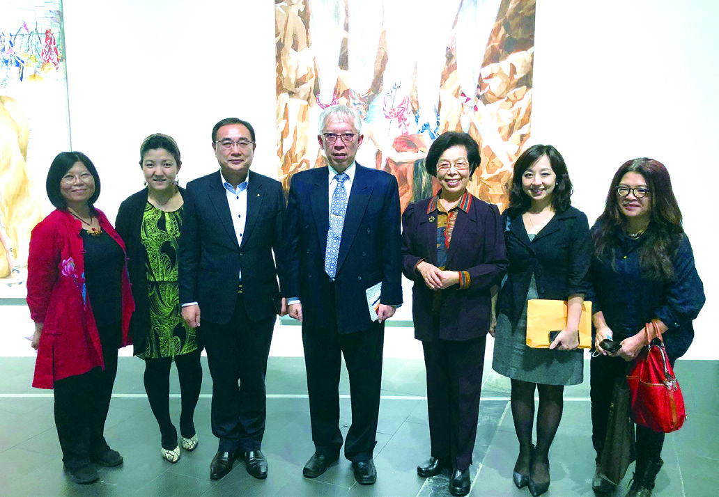 國美館新任館長梁永斐(右4)、前監察院長張博雅(右3)與副理事長洪玉柱等人合影。