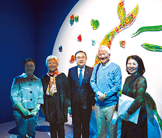 台大醫學院名譽教授胡海國(右2)前來觀展,與創作者賴純純老師(左2)合影。