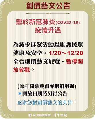 2.全台各地藝文中心及花蓮、屏東文化會館之展覽,暫停開放。
