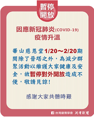 4.華山慈恩堂除晉塔之外,暫停開放。晉塔儀式取消勤行、唱題程序。