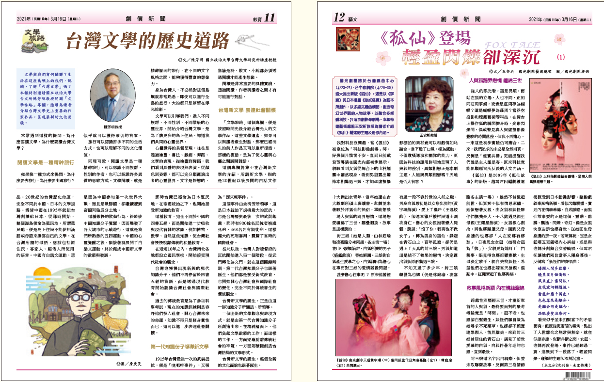 「藝文」版方面,則邀請到研究傳統戲曲與創作的泰斗——國光劇團藝術總監王安祈教授,為讀者介紹4月份該團新推出的劇碼《狐仙》。該劇以動漫與網路世代之思維,跳脫京劇傳統的敘事模式,創造出奇幻世界觀的人物故事;特別是,更善用現代科技來構成影像劇場。精彩動人的內容,值得讀者一看。