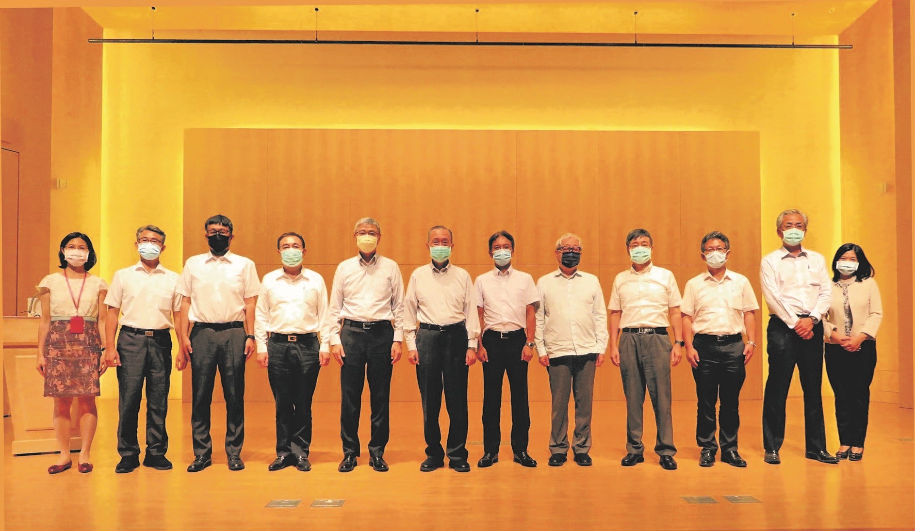 承建高雄文化會館的中鹿營造公司董事長小俣悌二(右6)、大矩聯合建築師事務所楊逸詠(右5)及白榮宗建築師(右4)、新菱機電公司總經理林一隆(右3)等一行人,7月27日下午,專程蒞臨至善文化會館拜會林釗理事長。