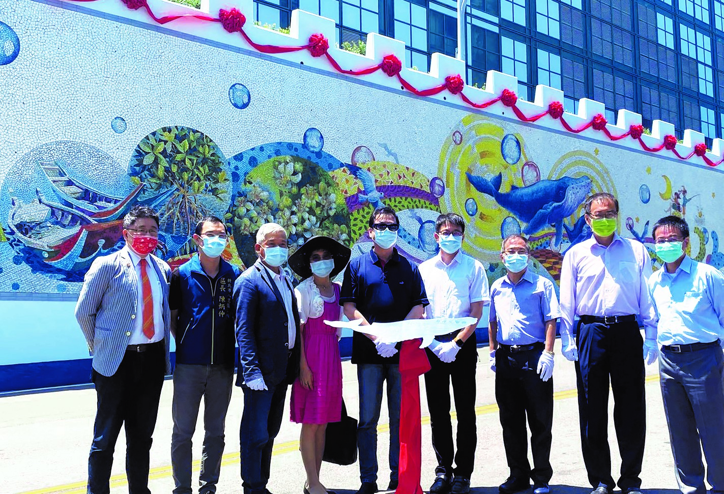 知名雕塑藝術家、創價藝術部成員的吳建福(左3),應邀為八里垃圾焚化廠製作大型馬賽克壁畫,8月20日,在新北市副市長劉和然主持下,於該廠盛大舉行開幕儀式。