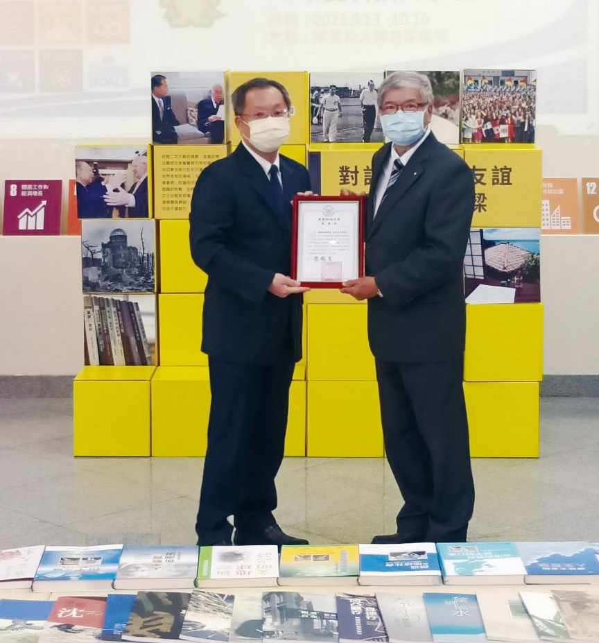 陳錫圭校長(左)頒贈感謝狀給池田SGI會長,橋和圈圈長林永順代表接受。
