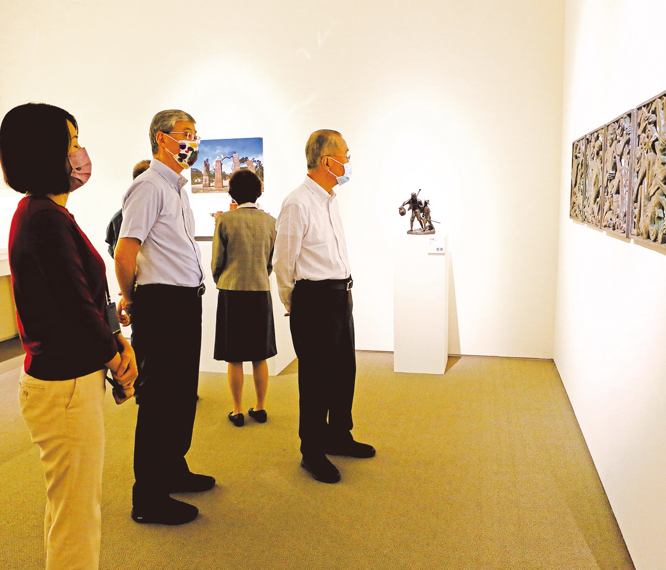 隨著疫情趨緩,公私立美術館、藝文中心陸續開放,2021年第三檔創價藝文展也於9月29日在全台各地藝文中心重新開放參觀,10月19、21日,林釗理事長特地前往板橋、至善兩處藝文中心觀賞李郁周書藝展、郭清治雕塑展。