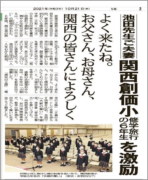 《聖教新聞》報導池田先生鼓勵關西創價小學生的訊息