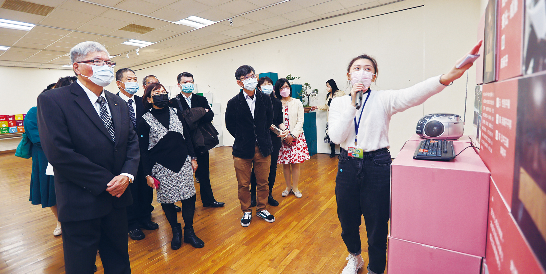 | 台藝大大學會校園代表梅祐寧(右1)為羅景中館長(前排左3)導覽 |