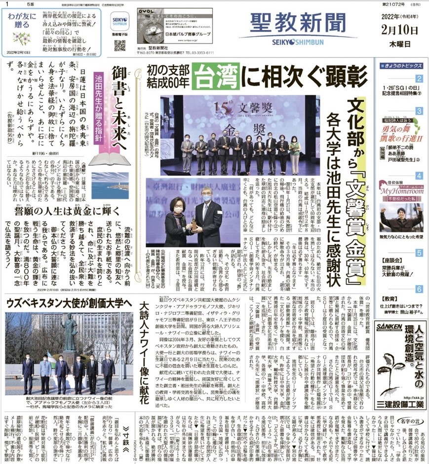 創價獲頒文馨獎的好消息,除了國內各大媒體的報導之外,日本《聖教新聞》也在2月10日頭版給予大幅刊登,祝賀台灣SGI的獲獎!