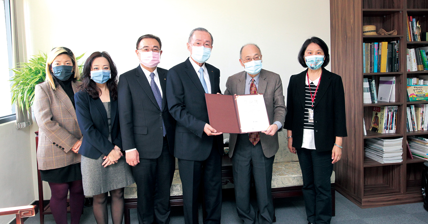 | 林釗理事長(右3)致贈故宮「法華經抄本系列」,吳密察院長(右2)代表接受。 |