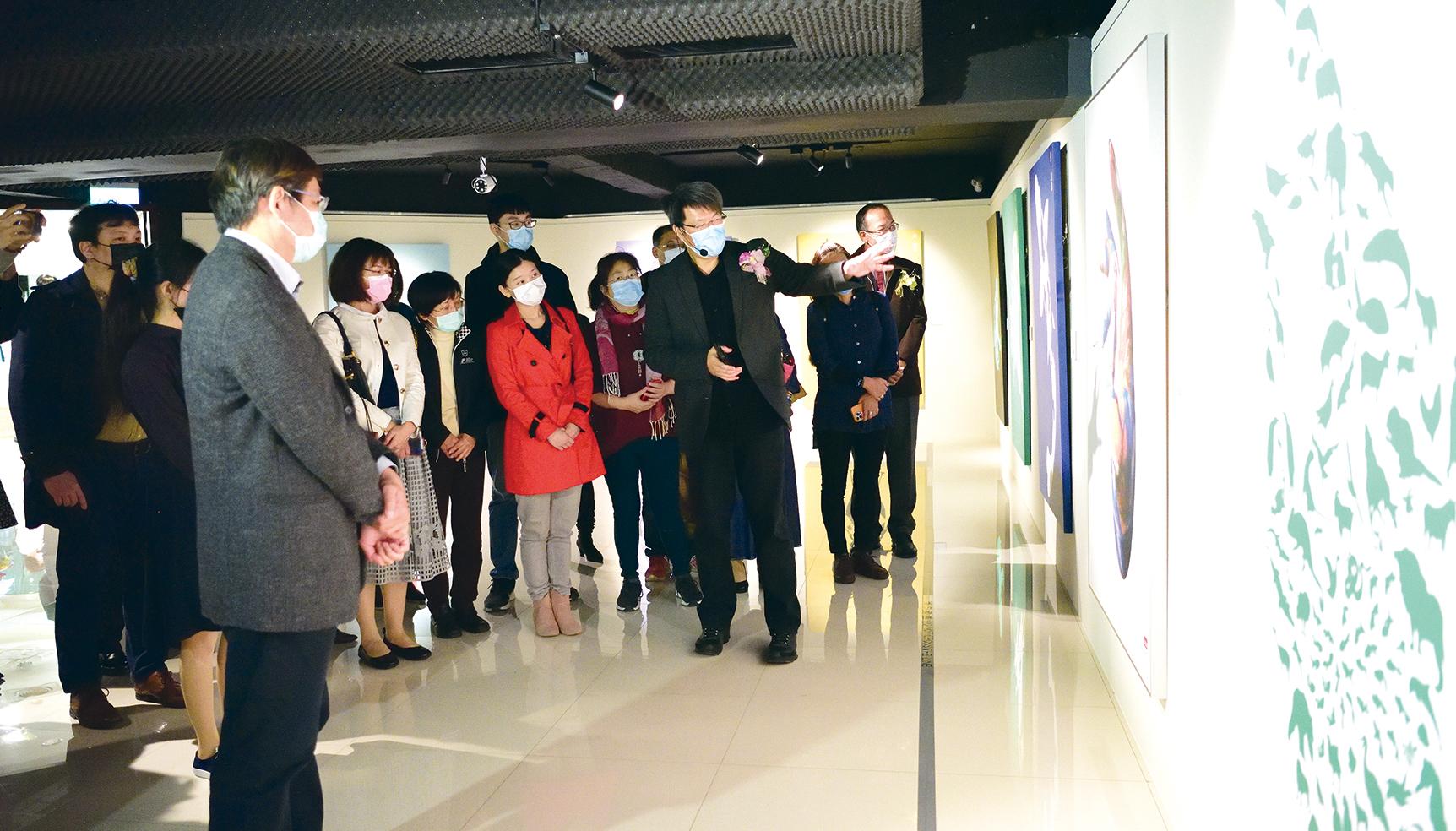 | 林俊良教授(右2)為貴賓介紹作品創作理念 |