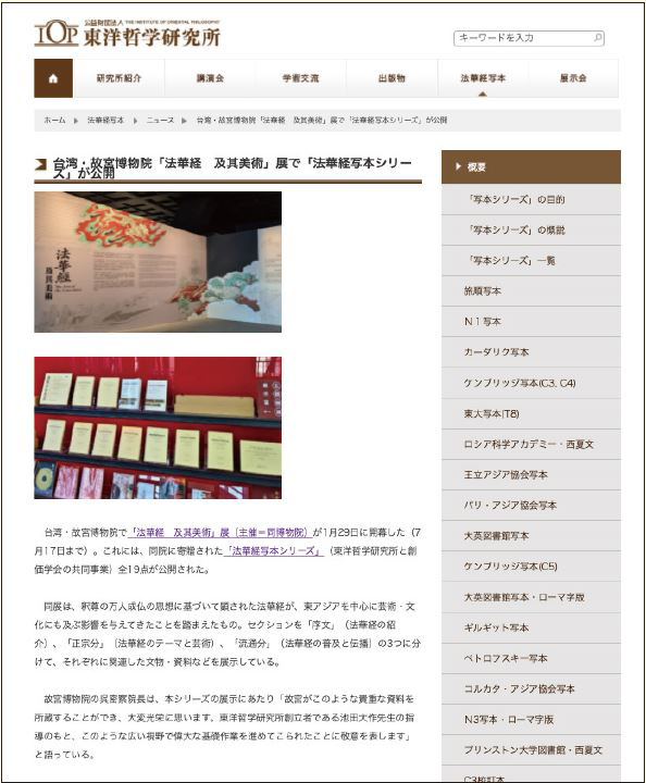 池田SGI會長創辦的東洋哲學研究所(簡稱東哲),近日在官網上介紹國立故宮博物院目前正在舉辦「《法華經》及其美術特展」,及日前林理事長代表創價致贈東哲與日本創價學會等單位合作出版之「法華經抄本」給該院的訊息。