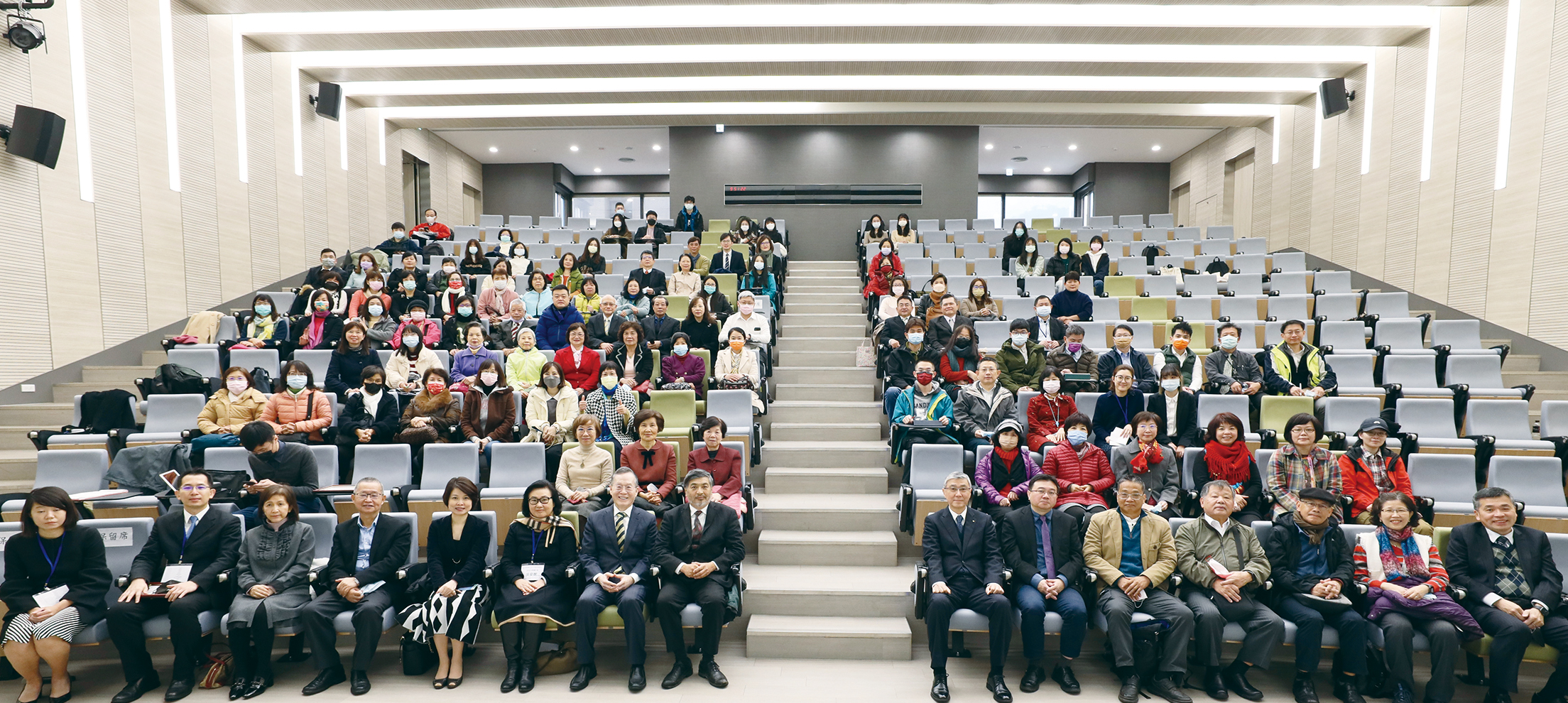 | SDGs展開幕典禮,政大校長郭明政(前排左8)與該校師生、創價代表合影。 |