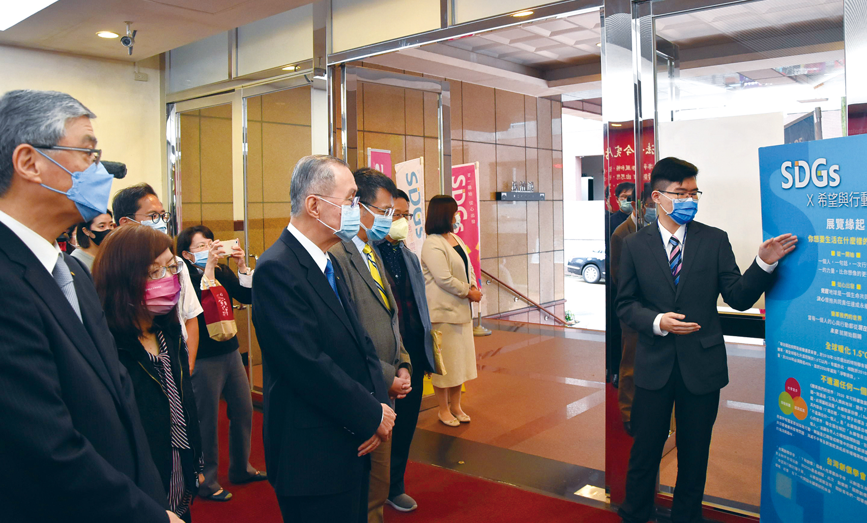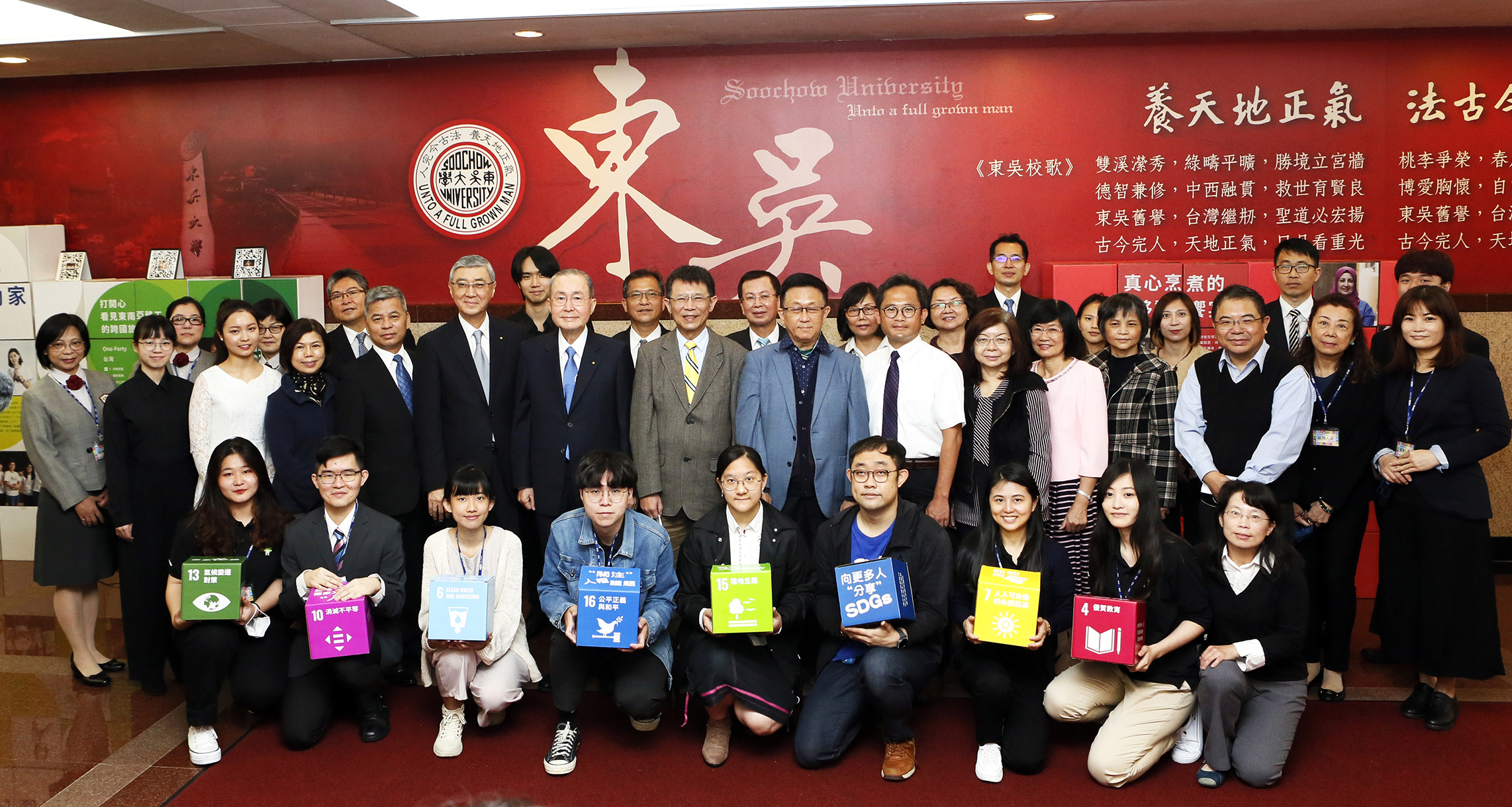 | 創價與東吳大學合辦SDGs展,潘維大校長(二排左8)與林釗理事長(左7)共同主持。 |
