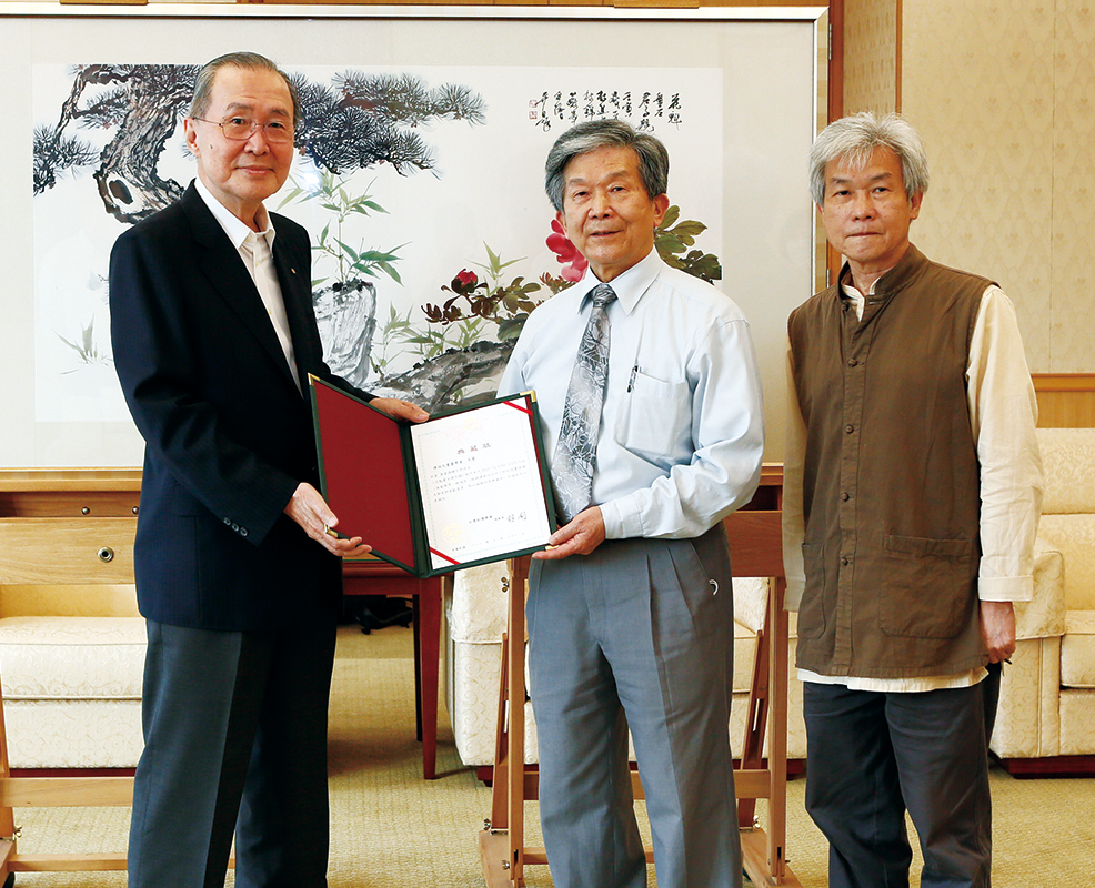 傅狷夫書畫學會理事長羅振賢(圖中)、秘書長林錦濤(右1)於3月21日下午蒞臨至善文化會館訪問,將該會成員蘇峰男、林進忠及林錦濤共同創作的水墨畫作〈花魁磐石君子親〉致贈給創價典藏,林釗理事長代表接受。