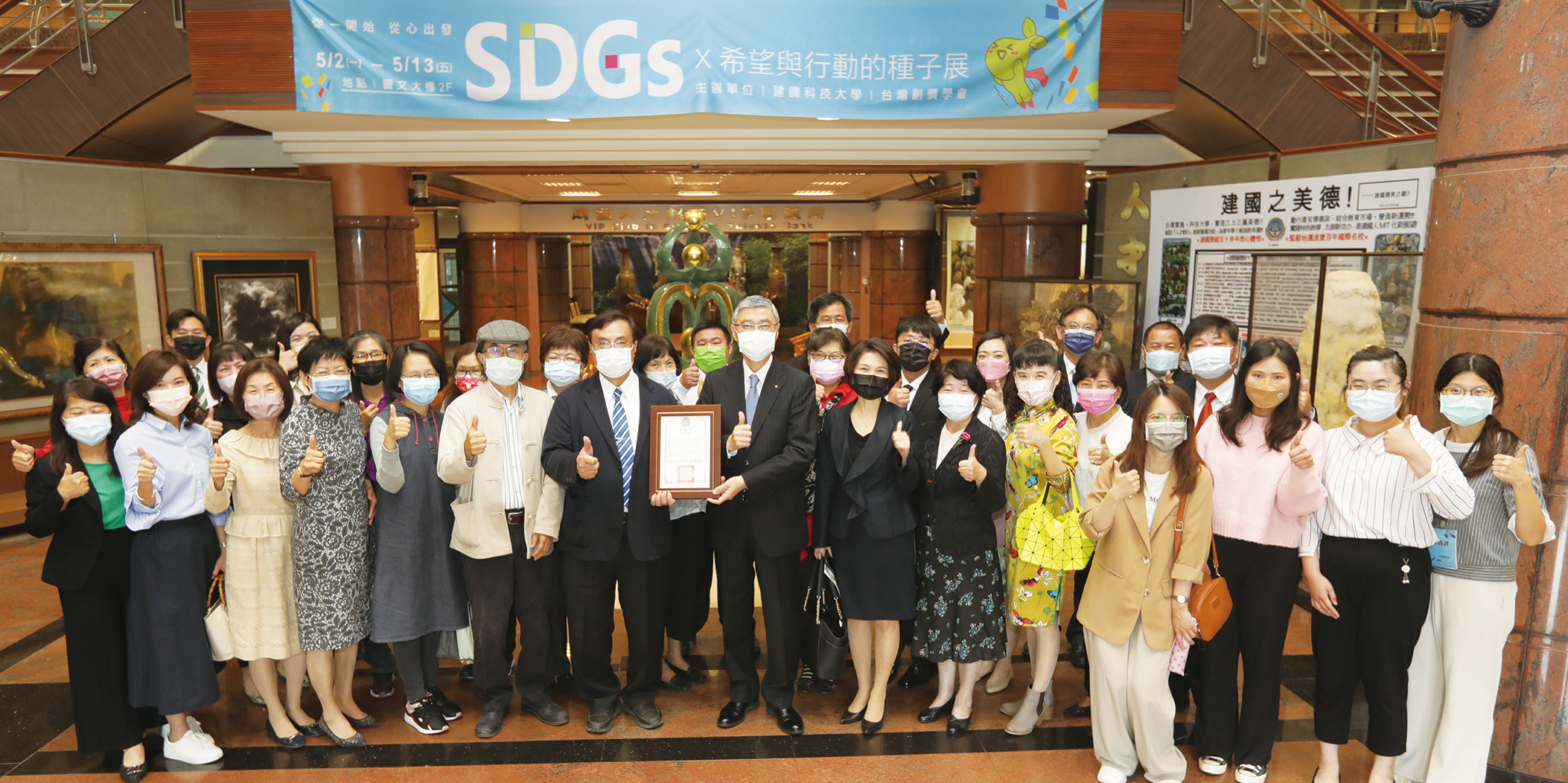 5月3日,創價與建國科技大學共同舉辦的「SDGs×希望與行動的種子展」,於該校圖文大樓一樓舉行開幕典禮,校長江金山、設計學院院長林清鏡、視覺傳達設計系教授林睿琳及創價副理事長林廷鋒等出席盛會。