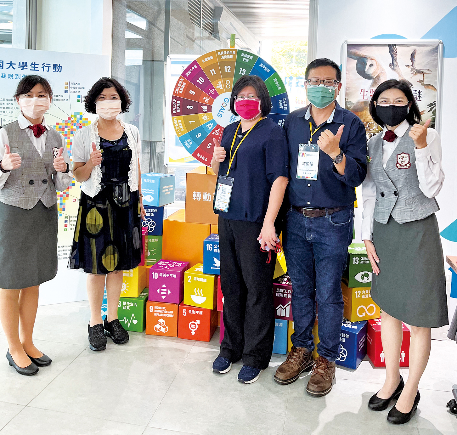 | 教育部新世代環境教育發展政策推動專案計畫主持人許毅璿教授(右2)、黃琴扉副教授(右3)參觀SDGs展。 |