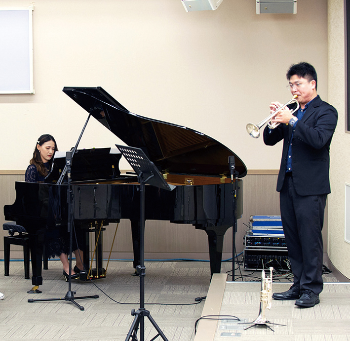 教學一開始,創價勝利管弦樂團成員葉棟樑、賴柔均以小號及鋼琴合奏〈舒伯特小夜曲〉、〈永遠的師弟之旅〉等樂曲,為活動揭開序幕。