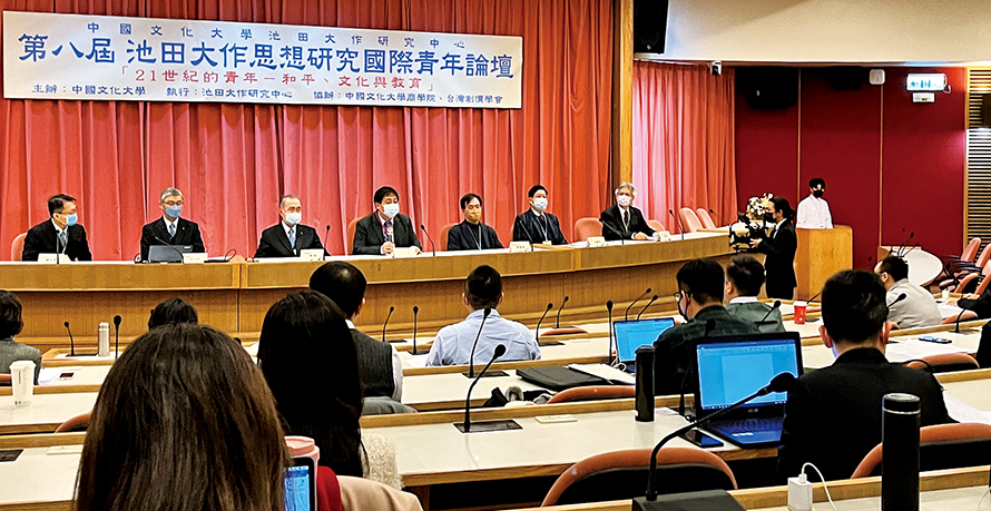 12月17日,中國文化大學「池田大作研究中心」以「21世紀的青年——和平、文化與教育」為主題,在該校曉峯紀念館國際會議廳盛大舉辦「第8屆池田大作思想研究國際青年論壇」。這是距2019年的第7屆,大家超越疫情、睽違3年再次舉辦青年論壇。此次,共有來自臺灣大學、中山大學、清華大學、淡江大學、中國文化大學等校之碩博士生,就COVID-19、俄羅斯入侵烏克蘭、SDGs、經濟、和平、教育等議題分別發表了7篇研究論文,探討如何以池田先生之和平共生思想來面對各種課題。當天,雖然寒流來襲,仍不減文大師生及創價代表共100多人踴躍參加的熱情。