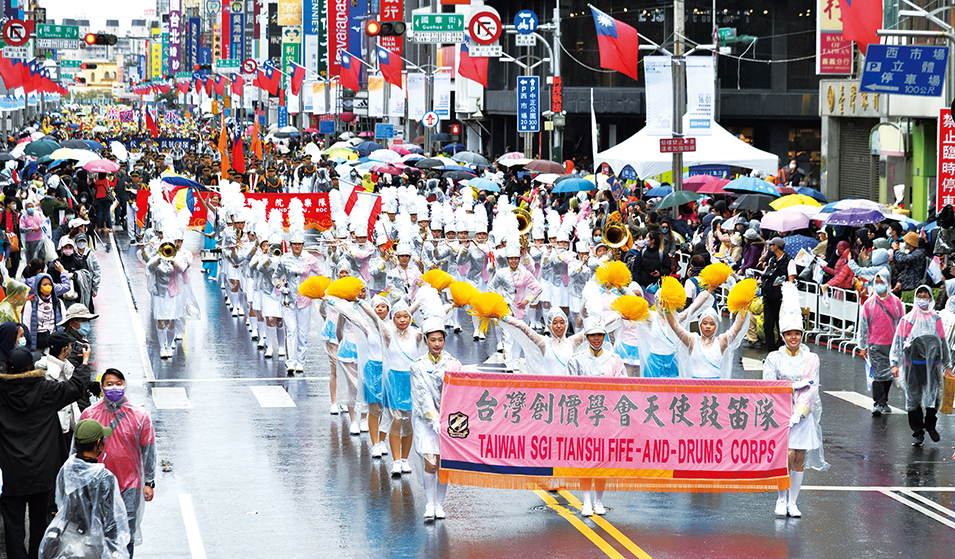 此次,創價特地由台北天使、高雄天使及台中華陽等3支鼓笛隊一共89位成員組團,與43支來自國內外的知名管樂隊伍,包括日本專修大學玉名高校吹奏樂部、台北市建國中學樂旗隊、台北市立景美女中樂儀旗隊……,從中央七彩噴水池出發,沿路吸引無數民眾駐足觀賞。
