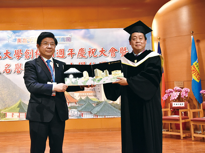| 創大校長鈴木將史(左)致贈紀念品給文大,由校長王子奇(右)代表接受。 |