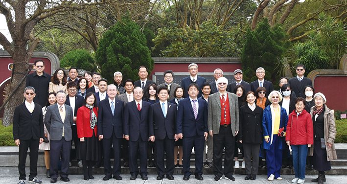| 創大校長鈴木將史(前排左6)、林釗理事長(前排左4)等一行在文大董事長陳泰然(右5)、王子奇校長(右6)帶領下,前往張其昀博士墓園前致敬並合影。 |
