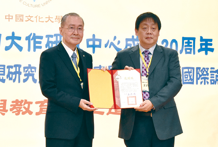 | 文大校長王子奇(右)頒贈感謝狀給創價,林釗理事長(左)代表接受。 |