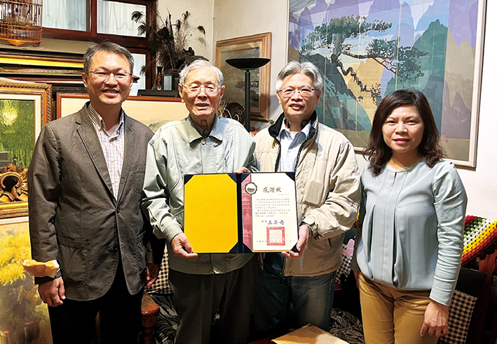 | 劉焜輝教授(左2)接受李彥良主任(左3)頒贈感謝狀,盧怡孝副理事長(左1)共同合影。 |