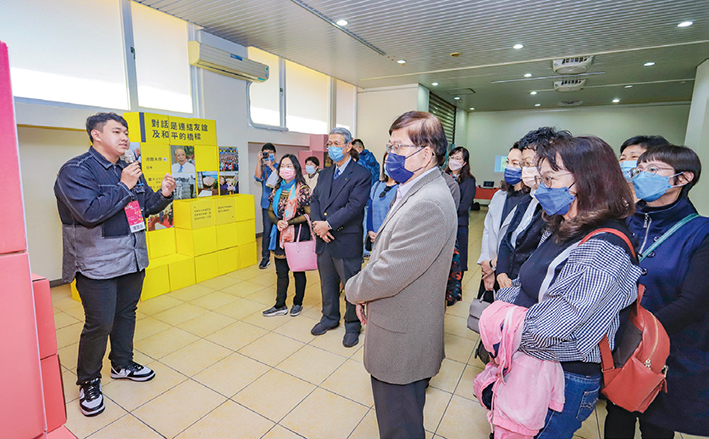 | 彰師大校長陳明飛(前排右2)及師長聆聽大學會同學導覽 |