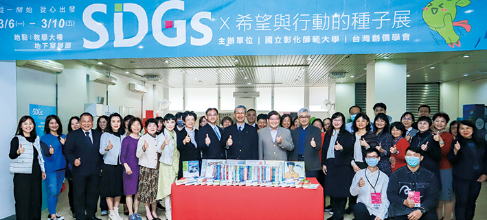 | 彰師大舉辦「SDGs×希望與行動的種子展」,校長陳明飛(前排左9)主持。 |