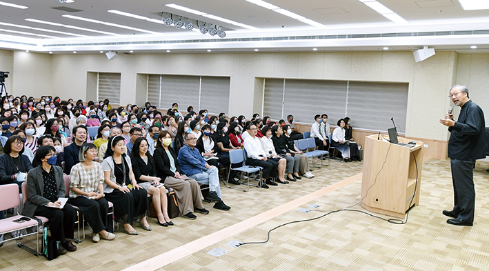 台灣的現代設計始於日治時期,經過戰後初期的蓬勃發展,如今已經累積百年歷程。在國際設計領域享負盛名的創價藝術顧問林磐聳教授,從政治、經濟、社會、技術等面向,詳細介紹百年來美術設計的發展及相關文獻。他強調,此次展覽以視覺藝術為焦點,可從台灣主體性、美術形式風格與設計功能性等三個面向來觀賞。對於創價20年來舉辦創價藝文展,投入中小學校園進行「行動美術館」及導覽志工長期的努力付出,林教授衷心表達敬佩之意。