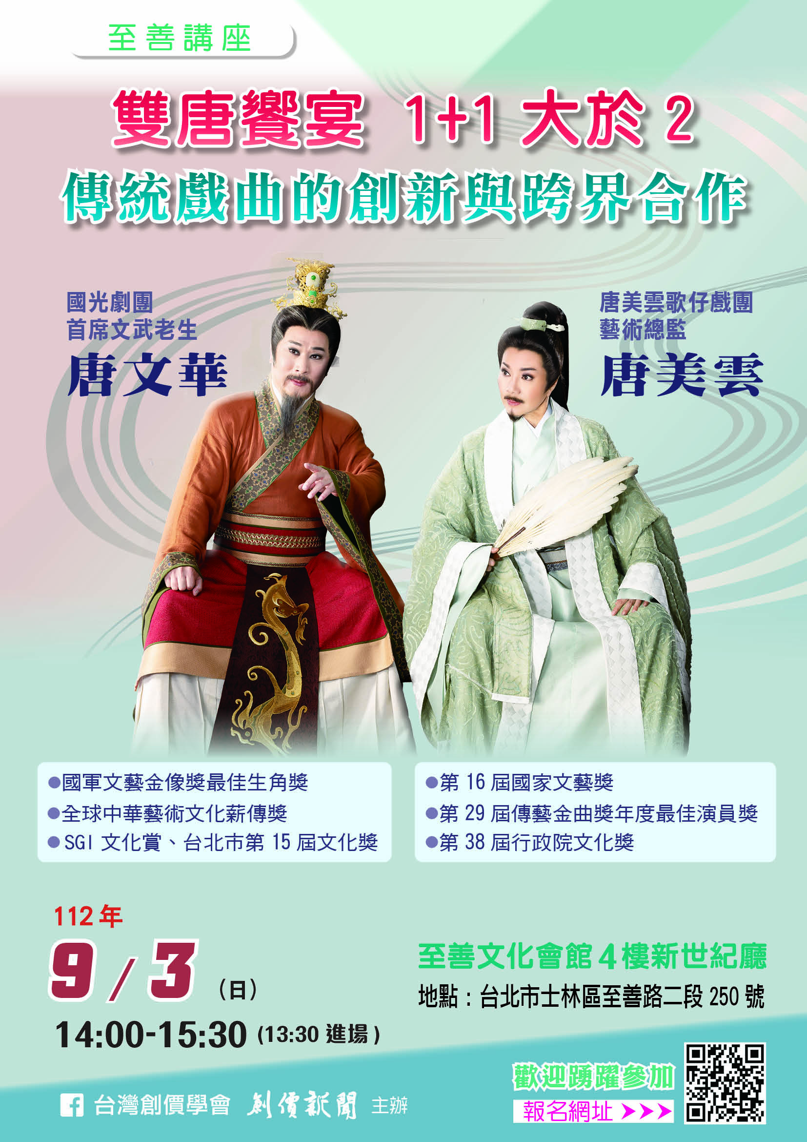 9月3日,創價特別邀請唐文華與唐美雲以「雙唐饗宴 1+1大於2 傳統戲曲的創新與跨界合作」為題舉辦專題講座,歡迎大家踴躍參加,聆聽今年剛入圍傳藝金曲獎最佳演員的雙唐,共同激盪出的藝術火花