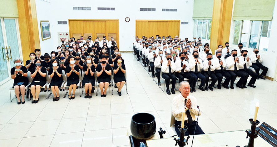 當天,林理事長除了對長年來在慈恩堂執行勤務、服務會員的工作人員致上誠摯謝意之外,並向大家傳達創價榮獲「宗教公益獎」及「宗教公益深耕獎」的好消息。他說:「因為有以朱名譽理事長為首草創前輩於台灣廣布初期的奮鬥,如今,我們才能喜迎台灣廣布的勝利成果,每年的追善回向勤行會,讓我們以題目來回向給已故的廣布前輩。」