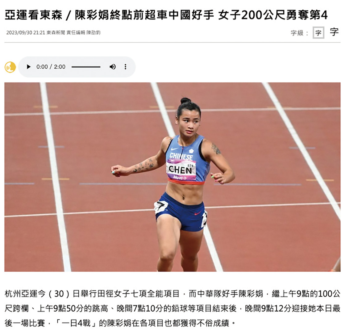 在杭州舉辦的亞洲運動會,9月30日舉行田徑女子七項全能項目競賽。 就讀臺北市立大學「陸上運動學系」的陳彩娟,於100公尺跨欄項目跑出14秒28的好成績,以排名第1的佳績戰勝烏茲別克、菲律賓、泰國及地主中國隊的好手,表現優異。 當天,陳彩娟在跳高、鉛球及200公尺短跑等項目也都有不錯的表現,為國爭光。